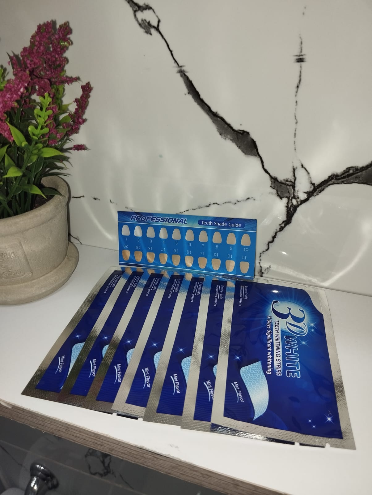 Hay siete sobres dentro de cada sobre, dos tiras de dientes arriba, que usas durante tres días, y se ve bastante bien.